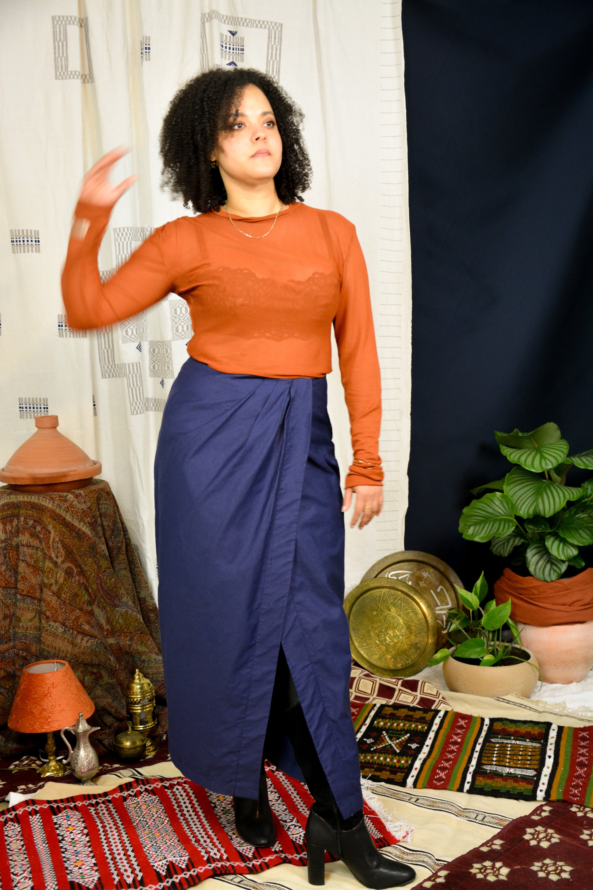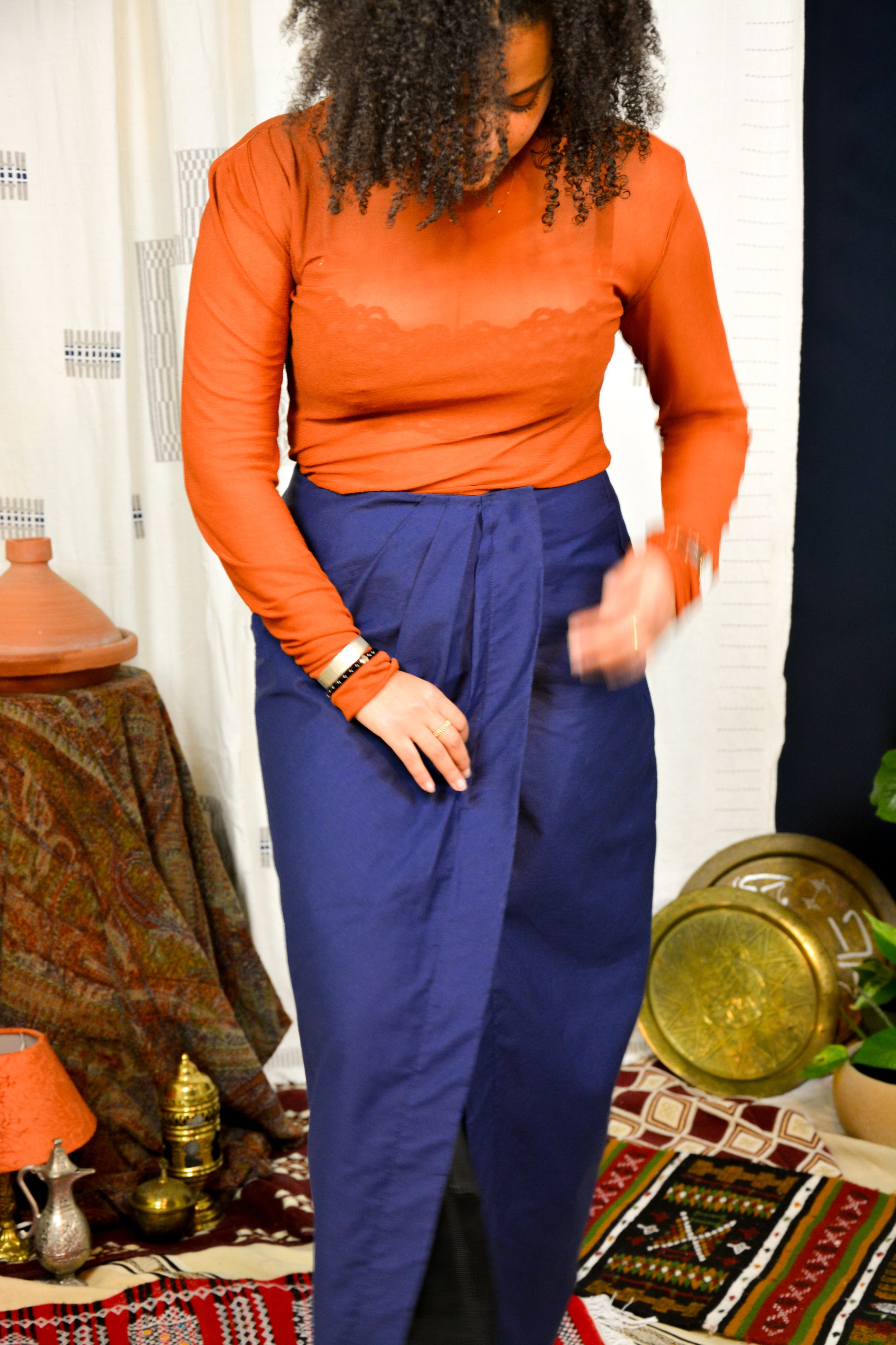 La jupe SIRR est une jupe porte-feuille plissée sur le devant, sa taille haute vient mettre en valeur les jambes, et les dévoile grâce à une fente légère
